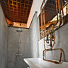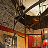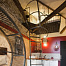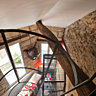 Mais le « la » est donné une fois le pas de porte passé. Une roue surdimensionnée de cage à hamster a été fixée à un des murs du salon. Et lorsque les hôtes ressentent le besoin de faire un peu d’exercice physique, il leur suffit de monter à l’intérieur de la roue en métal et de courir sur place. Une tablette, amovible, une fois calée sur les rayons de la roue au repos, fait office de table de repas.