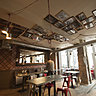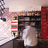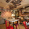 Le cadre se compose de mobilier industriel des années 70, de tapisseries et papiers peints façon "grand-mère" déchirés, de fauteuils de cinéma montés sur rail, de luminaires inventifs et de pêle-mêle de photos vintage au plafond…Carlos Pujol a volontairement vieilli les peintures. Il a chiné sur Paris des meubles industriels aux peintures colorées et écaillées qui semblent avoir servi de tons de base pour décliner des harmonies. Rangements à casiers, casiers à bouteille, boîtes de conserves ou parapluie détournés en abat-jour, meubles repeints débusqués chez Emmaüs, vieilles pubs recréent un univers réaliste comme dans un décor de cinéma. Et la cacophonie graphique donne l’illusion de la vérité, d’un endroit qui aurait vieilli comme cela d’un bistrot jamais complètement rénové…