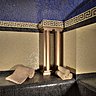 En revanche, la plupart des spas sont situés au rez-de-chaussée, voire même en sous-sol des établissements. Jacques Garcia, le décorateur de tout l’hôtel et du spa, a installé ses 1 000 m² d’espace bien être aux derniers étages de l’hôtel et leur a conféré une atmosphère d’Antiquité Romaine. Deux statues d’Apollon et de Vénus vous accueillent dès l’entrée ; les couleurs omniprésentes sont le rouge et le noir profond, le gris intemporel ponctué par les pierres brutes et les marbres. Couloirs et petites alcôves avec lits de repos en fer forgé vous conduisent à la piscine, un grand carré noir de jais creusé à même la roche et bordé de grandes colonnes rouges carmin. La verrière laisse filtrer le jour et la chaleur du soleil, son pourtour est parsemé de spots clignotants donnant l’illusion d’un ciel parsemé d’étoiles brillantes.