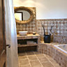 Les salles de bains sont faites de pierre naturelle du sol aux murs, les peintures sont réalisées à la chaux cirée, chaque chambre a sa propre tonalité, son âme, et toujours un même esprit : des équipements de qualité (écran plat Loewe…), des poutres en noyer ciré… Du confort et de la simplicité : un luxe discret.