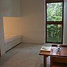 Modernité avec des chambres installées à quelques mètres du bâtiment principal dans une construction de béton brut, sobre et filiforme, protégée par un mur avec en son sein, dallages de pierre grise et gravier qui rappellent les codes des jardins zen. Les chambres sont extrêmement épurées, le lit installé dans une alcôve, la fenêtre juste à côté vous offre une ouverture directe sur la forêt alentour. Et si les toilettes sont protégées par une porte, la baignoire est, quant à elle, installée directement dans la pièce. Une table en bois en parfaite harmonie avec l’ensemble vous invite à l’écriture, à la réflexion, ou à profiter d’une des boissons du mini-bar.
