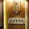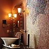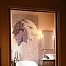 Entrons dans la salle de bain ; Face à vous, une mosaïque représentant une femme vous accueille ; une baignoire à pieds encadrée de deux petits meubles traditionnels revisités sur lesquels sont posés des lavabos contemporains avec toujours les interrupteurs et les prises en nacre blanche de Von Oberndorff, une petite touche supplémentaire de raffinement !