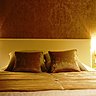 Entrons dans la chambre témoin, la première impression est un décor chaleureux et précieux, les murs sont recouverts d’un revêtement mordoré avec un grand damas du belge Arte ! Un lit spectaculaire trône au milieu de la pièce avec des coussins accueillants recouverts d’un velours chatoyant coordonné à un chemin de lit avec des gros boutons et une tête de lit recouverte en imitation de peau d’autruche le tout fabriqué dans les ateliers de confection Ami Lenglart.