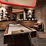 Une fois, la porte siglée d’un grand « M » poussée, une ambiance élégante de chalet montagnard est mise en valeur par la présence de la pierre brute et du bois sous toutes ses formes. D’un côté, c’est un petit salon meublé de fauteuils confortables autour d’un feu de cheminée. Une atmosphère sympathique et conviviale rendent cet endroit propice à la détente ou à la lecture. De l’autre, un bar imposant par la multitude des rondins de bois permet de déguster à tous moments, un vin chaud excellent que je vous recommande, préparé par Grégory, ou encore un Bedton’s, un old fashion bourbon infusé au bacon !