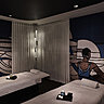 Vous vous retrouvez comme si vous arriviez chez des amis. On est loin des codes couleurs habituels des spas. Jean-Philippe Nuel s’est occupé de la décoration, en reprenant les codes en référence de l’histoire de la piscine Molitor. Ce sont donc des nuances bleutées comme le bleu canard, des carreaux de ciment, des photos en noir et blanc… le tout agrémenté d’un mobilier année 60. Le spa dispose de 13 cabines.