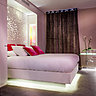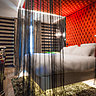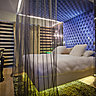 La chambre Dalhia est théâtrale, elle est tapissée de tissu tendu velours à motif floral bleu, rouge et rose. Un lit rétro éclairé à effet “lévitation”, des matières réactives à la lumière, des appliques en plexi irisé, et en tête de lit la sculpture lumineuse en aluminium signé de la créatrice Valérie Boy.