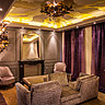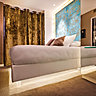 La chambre Velvet est sensuelle et cosy : moquette épaisse, velours au tissage texturé à motifs floraux en tête de lit (encadrée de feuille d'or), skaï mordoré sur les murs et belles appliques chandelier en plexi.