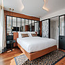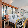 Dans les 6 catégories de chambres, Paris Style, Bobo, Urban, Artist’s studio, Skyline et Penthouse, on retrouve du mobilier de référence, des canapés dessinés sur mesure, du linge de lit de marque (Garnier Thiébaut), des luminaires de Tom Dixon ou de Art et Floritude. Avec un parti prix architectural unique, les chambres donnant sur les boulevards ou avec vue terrasse, s’offrent des hublots de voyage au format XXL. La palette de couleurs sourde est inspirée de l’environnement parisien, gris zinc et bruns, électrisée par des touches d’orange, de jaune et de rouge.