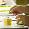 Si la Saint-Jacques vous est offerte, elle sera simplement poêlée à la plancha avec un concentré de cédrat pour l’aromatiser. Mythique, le foie gras de canard est juste saisi et posé sur une galette de maïs avec du miel d’acacia, de la chapelure végétale, une réduction de vieux vinaigre. La langoustine royale est cuite à l’unilatérale (mi-cuite, mi-crue donc), l’accompagnent un riz carnaroli et des lamelles de pomelos, l’ensemble étant saupoudré de thé chinois fumé, le Tarry. La grenouille se voit dépecer de ses cuisses et de ses mollets pour être cuisinées avec un soupçon d’ail, celles-ci sont posées sur un faux risotto (sans riz) fait de pignons de pin et copeaux de jambon travaillés au parmesan et à la crème fraîche ; pour apporter une note gustative verte et une touche colorée, une émulsion de persil repose au fond de l’assiette. Tranchés épais, des tronçons de veau offrent leur rose tendreté, les couronnent un carpaccio de veau et des lamelles de veau confites, les haricots blancs sont relevés par du chorizo. Le filet de pigeonneau est rôti, alors que la cuisse du volatile est confite et frottée aux dragées, en garniture de doux oignons roussis. Dans tous ces plats, la légèreté est omniprésente, car beurre et crème fraîche sont très peu utilisés, place est faite à des bouillons, des émulsions de plantes, des réductions d’épices.
