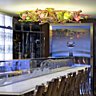 Au premier coup d’œil : un immense bar lumineux en inox poli noir où sont joliment exposés une multitude d’ingrédients et certaines gourmandises comme des macarons, les chaises hautes sculpturales couleur aluminium, desphotos géantes illustrant une panoplie de fruits, un beau décor qui exprime la fraîcheur du lieu. Pour donner l’ambiance : 14 écrans plasma XXL programmant des œuvres vidéos.