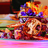 Place donc à des compositions très inédites qui mettent en valeur poissons et viandes par leurs associations avec des fruits et / ou des fleurs. Le crabe et l’avocat sont révélés par le coquelicot et sa senteur ; les sépions en plancha sont relevés par des pistils de safran ; les fleurs de bourrache exhaussent l’iode de noix de Saint-Jacques posées sur des pousses d’épinards ; l’épaule d’agneau est cuite dans un jus à la lavande ; la côte de veau se pique d’une sauce mandarine ; les salades se prêtent à des festivals floraux et les desserts à des symphonie fruitées : craquant de pommes abricots-lavande, des fruits frais parfumés à la rose ; baba au rhum aux saveurs exotiques ; fraises en fines lamelles séchées très longtemps et comme cristallisées…