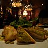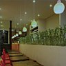Au mur : une peinture sans solvant et des photos sur papier écolo. Pour la partie récup, d’insolites luminaires ornés de couverts en inox. Le bar paré de coques de coco donne la touche d’exotisme.