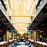 Le lieu est en effet gigantesque puisque 550 couverts ont été installés sur les anciens quais et qu’au bout du quai il y a, pour le farniente gourmand, une des plus grandes terrasses de la capitale (180 places assises). De l’aménagement de la ligne en 1854, il ne reste plus rien, hormis quelques détails comme le numéro des voies, l’horloge, les piliers, l’impressionnante hauteur sous-plafond atténuée aujourd’hui par de grands voilages. Ces grands rideaux donnent une impression de légèreté à l’ensemble qui respire néanmoins le béton, les structures en acier et le verre. Pour anoblir un peu l’environnement, une gigantesque boule de bronze recouverte de feuille de bronze trône au milieu de l’allée centrale encadrée par des colonnes habillées elles aussi d’or.