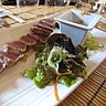 Lors de mon passage, l’ardoise d’entrée proposait en petites proportions une salade thaï, un léger tempura de lingue et sa sauce kimchee (piments et chou chinois), un nem de légumes et feta à tremper dans une sauce au miel et romarin. Suivaient sur une seconde ardoise un wok bien épicé de crevettes, moules et salicornes, un rouleau de printemps au saumon, un émincé de crabe au radis, un poisson sur une purée de pommes de terre au wasabi. Au gré de la criée et des idées du chef, ces ardoises changent souvent. Et si vous n’aimez pas la multitude de saveurs des petites portions, votre choix peut se porter à la carte sur une salade de bœuf thaï (8,50 €) et un curry de crevettes à 17 €.