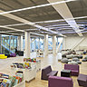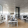 La bibliothèque Alexis de Tocqueville est située dans une zone qui relie la ville ancienne de Caen et sa nouvelle partie en développement, qui intègre notamment la Maison de la Recherche et de l’Innovation et l’Ecole Supérieure d’Arts et Médias. C’est un quartier animé et ouvert sur la jeunesse. La forme particulière du bâtiment, en Croix de Saint-André, est extrudée pour libérer, en son cœur, un espace de près de 2500 m² d’un seul tenant, libre de tout cloisonnement et de murs porteurs. D’une hauteur de 18 mètres, la bibliothèque repose sur ces quatre noyaux structurels situés aux extrémités du bâtiment et sur lesquels s’appuient deux poutres en treillis de respectivement 96 et 85 mètres de long qui portent le dernier étage. Au rez-de-chaussée, un forum ouvert sur l’environnement urbain donne accès à un auditorium de 150 places, un restaurant de 100 couverts et un espace d’exposition de 350 m². Les points associés aux services, tels que les bureaux des bibliothécaires, les accès au catalogue et les bornes de retrait de prêts ont été dessinés sur-mesure pour la bibliothèque par les architectes de l’agence OMA. Très simples, ils ont été réalisés en Corian® bleu foncé.