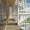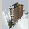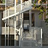 Cet immeuble en bois, imaginé pour le site de la rue Piat, à Belleville, en habitat participatif a été conçu par l’agence d’architecture arba (Jean-Baptiste Barache & Sihem Lamine) associé l’architecte à Jean-Loup Baldacci : « C'est un immeuble en KLH ® * sur R+7, légèrement galbé, enveloppé de tasseaux de mélèze avec, comme il se doit, des logements sociaux, des mixages intergénérationnels, des potagers à tous les étages, un poulailler, des ruches , une auto-construction partielle... », raconte l’architecte Jean-Baptiste Barache. Son ossature bois (CLT **ou KLH®**) pour les étages s’associe à une structure béton pour le sous-sol et le rez-de-chaussée. Le bois est à la fois matériau structurel (qui permet de travailler en préfabrication, et de réduire le temps de chantier) et matériau de finition car les panneaux de CLT ** sont toujours visibles à l'intérieur. La structure de l'immeuble se fait ainsi partout sentir, et l'habitant se promène dans une charpente plus que dans un appartement.