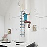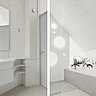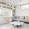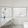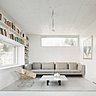 L’entrée est située sous la maison où se nichent également la voiture et le bois de cheminée. Au rez-de-chaussée, l’espace fluide se déploie avec trois pièces en enfilade qui communiquent et s’organisent autour d’une cheminée centrale, qui assure à elle seule le chauffage de la maison. La cuisine et un salon intime sont aménagés de part et d’autre de l’escalier qui mène à un salon traversant ouvert sur une vaste terrasse en porte-à-faux sur la rue. Au second niveau, sont situées les chambres avec des fenêtres en hauteur qui orientent la vue sur le ciel.