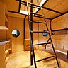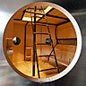 De dimensions réduites (diamètre : 3,80 m et hauteur : 3,92 m), il a été aménagé, au millimètre près, avec une gestion rigoureuse de l’espace. C’est une des spécialités de Charlotte Perriand, qui a très souvent travaillé sur la thématique du gain de place. Et dans ce tonneau, habitable sur 2 niveaux, on entre par un sas qui donne accès à un rez-de-chaussée, composé d’une grande pièce principale. Un débarras pour les sacs à dos et les skis a été prévu. A l’intérieur, tout de bois vêtu, d’un côté, on trouve un espace cuisine intégrée. De l’autre, 2 lits individuels qui s’ajoutent à un espace chambre, en soupente. En tout, de la place pour accueillir le couchage de 8 personnes. Côté chauffage, un poêle est inséré à l’intérieur du tuyau central qui réchauffe toute la pièce. Et dans un esprit de structure évolutive, Charlotte Perriand avait dessiné trois modèles de refuge Tonneau, adaptés pour 8 à 48 personnes.