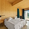 A l’intérieur, le bois est brut et apparent ce qui limite l’usage des peintures et autres parements. Les chutes de bois CLT, panneaux de bois lamellé croisé à usage structurel (sols et murs) ont été réutilisées pour réaliser le mobilier intérieur : lit, tables, étagères... La piscine et les maisons sont uniquement alimentées par l’eau de sources des montagnes environnantes. Une chaudière à bois déchiqueté produit l’énergie nécessaire pour chauffer la piscine et les cinq maisons du hameau du domaine des Chauvins. À terme c’est le bois récupéré sur le domaine qui alimentera la chaudière.