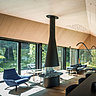 A proximité de Vilnius, capitale de la Lituanie, le cabinet d’architecture Arches a conçu le projet de cette villa, en 2016, dans un esprit contemporain et écologique. Trois ans d’études et de travaux de construction ont été nécessaires pour mener à bien ce projet exceptionnel. La forêt dense et boisée a été la première contrainte. Il a fallu adapter le projet de la nouvelle maison en créant des niveaux et des terrasses en harmonie avec la pente du terrain naturel. Pas moins de 650 m² de bardage extérieur en bois durable Kebony ont été utilisés pour la réalisation et l’intégration de cette architecture à la fois étonnante et rigoureuse, conçue pour se fondre dans le paysage. Le porte-à-faux impressionnant, le bardage naturel en bois, la toiture à pans coupés et pignons irréguliers, sont les caractéristiques mettant le bois en valeur en harmonie avec les collines et pins environnants.
