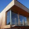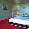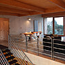 Les pièces de vie sont situées dans le volume supérieur, très bas, entièrement construit en bois, légèrement surélevé par rapport au terrain naturel et totalement transparent. Un chemin en bois lie l’espace d’habitation et second volume, au premier étage. A l’approche de la maison, ce platelage qui traverse le terrain se transforme en pont, pour exprimer le décollage du sol du projet et mettre en scène l’entrée.
