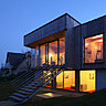 « Le terrain, très étroit, orienté nord-sud, présentait une forte déclivité et offrait une vue dégagée sur la mer située à 100 mètres. Elle a été exploitée au maximum, tandis que l’impact de la construction sur le paysage a été le plus minime possible », explique Régis Barrot. Et le dessin de la maison s’est fragmenté en deux entités volumétriques de faible importance. L’une, située en partie haute, regroupe un auvent marquant l’entrée, un garage et un atelier de peinture. L’autre, située un peu plus bas, abrite les pièces d’habitation. Le volume supérieur est inscrit en débord par rapport au volume inférieur, de façon à décoller la maison du sol et donner la sensation qu’elle flotte dans le paysage.