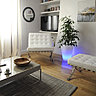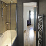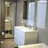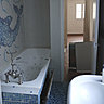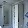 Les éléments de la salle de bains, entièrement relookée, n’ont pas bougé, si ce n’est le lavabo qui a été déplacé. On a travaillé un espace commun intégrant baignoire et douche. Dans l’espace gagné sur l’ancienne douche, on a aménagé une mini buanderie qui renferme le lave-linge. Et la présence visuelle de l’escalier repeint en blanc, s’efface dans le mur, pour alléger l’espace.