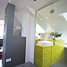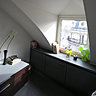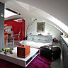La zone centrale où la hauteur sous plafond est la plus élevée, a été aménagée en cuisine. Quant aux parties les plus basses (moins de 1,80 m), elles accueillent la salle de bains, le coin bureau, la chambre et d’autres rangements. Portes coulissantes, pliantes ou rideaux assurent une intimité, lorsqu’elle est nécessaire, sans encombrer l’espace. L’appartement permet aussi de profiter d’une vue à 360 ° sur les toits de Paris qui se découpe à travers les différentes fenêtres comme de bien jolies cartes postales.