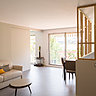 Situé dans une résidence construite dans les années 1970, cet appartement classique de 73 m² a été partiellement décloisonné pour offrir une agréable sensation d’espace, comme s’il avait été agrandi, et le rendre plus lumineux. Aucune cloison n’a été complètement démolie, seule la cloison qui séparait la cuisine du séjour a été légèrement repoussée et l’entrée ouverte. Mais désormais de partout, on bénéficie d’une lumière généreuse grâce aux grandes baies vitrées du salon. « L’appartement démodé et vieillot était décoré avec une moquette défraîchie, un parquet standard et des papiers-peints d’une autre époque. Le budget de la propriétaire était limité. Il a fallu dégager des priorités », explique l’architecte Flora Auvray qui a doté la cuisine d’un claustra ajouré en bois et remplacé les portes battantes qui séparaient le séjour par une porte coulissante qui s’escamote dans la cloison. Une modification qui change radicalement la perception de l’espace.