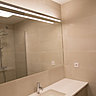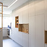 Le claustra en bois (non vitré) sépare la cuisine sans l’isoler. « Nous avions d’abord évoqué la possibilité d’une verrière façon atelier en acier pour séparer la cuisine du séjour, mais ce type d’aménagement aujourd’hui très usité, risquait d’alourdir l’espace. Et la propriétaire souhaitait, au contraire, un aménagement qui rende les volumes plus fluides et aériens. » Et dans la cuisine, l’évier discret, placé dans un angle, est invisible depuis le salon. Au plafond, l’applique géométrique en plâtre (Atelier Sedap), dessinée sur mesure par Flora Auvray, suit le contour du claustra et apporte de la lumière depuis l’entrée jusqu’à la cuisine. La pose a été délicate car le plafond est en béton. Et aucun faux plafond n’a été posé pour éviter d’encombrer l’espace.