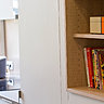 La propriétaire voulait conserver la bibliothèque présente dans la chambre et le canapé existant. Flora Auvray a choisi les teintes de vert aquatique (en camaïeu de trois tons proches) et un beige taupé (parfois métallisé) pour personnaliser l’espace en fonction des couleurs d’origine de ces deux éléments. L’ancien parquet en mosaïque de bois a été revêtu d’un linoléum (revêtement mince écologique) dans l’entrée, le séjour avec cuisine et le coin chambre (derrière la cloison coulissante) pour unifier l’ensemble du sol. Un grand meuble de rangement, intégré du sol au plafond, crée une jonction de l’entrée à la cuisine : des niches ouvertes apportent des touches esthétiques et évitent la sensation de monotonie en attirant le regard.