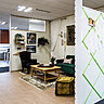 Pour meubler ses espaces, Didier Versavel a fait appel à la société française d’édition Dasras pour créer notamment des tables de réunion, des tables de repas pour la cafétéria, des tables hautes, des tables basses. Le designer a choisi également certaines créations qu’il a dessinées pour la firme Désio : le canapé et paravent acoustique Log, aux configurations modulables en fonction des espaces, le fauteuil Pompon qui fait référence au raffinement aux décorateurs des années 1930 et 40 et le modèle Twist, à l’assise garnie d’une couette en plumes.