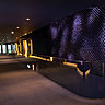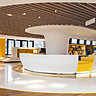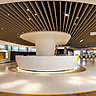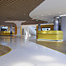 Largement vitré sur les 2 côtés, le hall offre des vues sur l’extérieur, sur la ville et le spectacle urbain, à l’instar d’un aéroport qui s’ouvre sur les pistes d’atterrissage ; la lumière, avant la plongée nocturne dans les salles de projection. Le lobby se découvre comme un feuilletage d’espaces. Les plans se détachent les uns des autres, se succèdent, se superposent comme pour le montage d’un film. Tandis qu’une vague ondulante structure le plafond et protège les spectateurs.