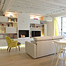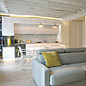 Pour agrandir la pièce principale, le mur de cloison qui séparait la chambre du séjour a été repositionné. La taille de la chambre a donc été volontairement réduite pour gagner de la place dans l’autre pièce. La poutre métallique a été blanchie pour se fondre dans le décor, et équipée d'un bandeau de Leds. La cuisine, la salle à manger et le salon ne font désormais plus qu'un. Aucune cloison ne les délimite et un agencement contemporain permet une plus grande fluidité de l’espace. La salle de bains a été rapprochée de la chambre, avec un accès direct et une position plus centrale. Les toilettes sont restées à leur place d’origine.
