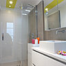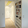 L’entrée et le couloir ont été par conséquence remodelés. Le couloir qui part de l'entrée, file dorénavant jusqu'aux fenêtres du salon. Il a été retravaillé, dans le même linéaire, avec une enfilade de rangements, et dessert successivement les sanitaires, le dressing et la cuisine ouverte sur le séjour vêtu ; le couloir s'habille d'une bande de couleur jaune au plafond qui apporte luminosité et gaité à l'espace. Avec ce nouvel agencement, l'entrée bénéficie aussi de la luminosité des fenêtres du salon donnant sur la rue.