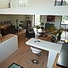 La grande pièce à vivre qui profite d’une hauteur sous plafond de 5 mètres, est caractérisée par la présence d’une plateforme étagée qui se transforme en terrasse aux beaux jours. Elle offre en toutes saisons une belle vue sur les toits en tuiles des maisons anciennes et leur architecture vernaculaire préservée. Il n’y a que les grandes villes de France qui cachent des trésors à redécouvrir…Auriez-vous deviné que celui-ci était situé dans une ville de moins de 7 000 habitants ?