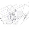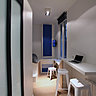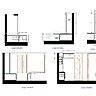Désormais le lit est placé sur une estrade dont le soubassement est composé de différents rangements. Une hauteur de 74 cm est exploitée en tiroirs, placards et boîtes. Les marches pour accéder au couchage s’intègrent à l’architecture de la chambre ouverte, de même que la penderie, grâce à un dégradé de tons de bleus. Le podium lui-même s’étend pour offrir un plan horizontal qui sert de bureau et de table de repas. La cuisine aménagée à l’opposé de l’installation précédente, profite de la lumière des deux fenêtres de la pièce à vivre. L’estrade cache aussi toutes les canalisations nécessaires à son déplacement et à sa nouvelle organisation. Un jeu de couleurs rythme l’espace, tandis que les nouveaux aménagements dessinés avec des lignes en diagonale agrandissent visuellement l’espace.