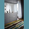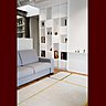 Ici la couleur sculpte l’espace et dessine les différentes pièces autant que les meubles. Le blanc et le gris dominent. Les espaces plus intimes comme la chambre et la salle de bains sont définis par des tonalités plus claires de beige. La pièce à vivre joue aussi sur des tons neutres, mais déclinant les gris réveillés par un mur peint dans un bleu nuit profond et des tapis de sol plus colorés. Le sol de l’entrée revêtu d’une moquette beige contraste avec le parquet en chêne massif de la pièce à vivre.