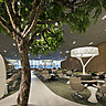 Dans une gamme de couleurs proche de la nature autour de grèges, de verts et d’ocres, les lieux semblent emprunt d’une certaine vivacité, par un subtil jeu de la lumière qui vient percer le bois perforé, le cuir surpiqué ou le Corian sculpté. Ainsi, les murs se parent de feuilles constituées d’un pointillisme végétal. Afin de garantir une fluidité des espaces et des services, les circulations sont élaborées à l’image de rameaux, avec des lignes courbes et tendues qui confèrent une certaine intimité sans aucun cloisonnement. Cette recherche de sérénité et de bien-être se conjugue avec une liberté d’action, qui laisse la part belle à une sensation de confort. Equipées de liseuses où brancher son ordinateur ou son portable, les assises intègrent des tablettes, dont certaines sont pivotantes dans un esprit modulaire entre recherche d’intimité ou de compagnie.