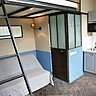 « J’ai été séduit par la jolie cour pavée parisienne à l’ancienne et la situation dans le quartier de La République, qui a aujourd’hui le vent en poupe. La façade vitrée, façon atelier, sur toute la longueur du local, offrait une belle source de lumière naturelle, et le parquet à chevrons ancien était en bon état malgré le manque d’entretien évident, » raconte l’architecte d’intérieur Grégory Gauthier qui a pu acquérir ce petit local à un prix très intéressant. Il a aussi tout de suite remarqué la hauteur sous plafond de 3,45 m qui permettait d’aménager une chambre sur une mezzanine. Cette structure a été réalisée sur mesure par un artisan serrurier et ferronnier, avec un acier brut noirci et oxydé puis verni.