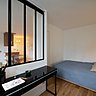 Une étude des gestes quotidiens a permis d’améliorer l’ergonomie dans la vie de tous les jours. La surface de la chambre initiale a été réduite au profit d’une grande pièce à vivre de presque 15 m². La cuisine cloisonnée a disparu au profit d’un îlot placé à proximité de la salle de bains pour profiter intelligemment des évacuations et arrivées d’eau regroupées au même endroit. La cloison de la chambre cache le lit, mais pas la lumière ni la perspective. Sur la partie basse maçonnée, un grand bureau a trouvé naturellement sa place. Et ce ne sont que quelques-unes des bonnes idées mises en œuvre, ici, dont certaines sont invisibles comme le camouflage du chauffe-eau dans le faux-plafond des WC, accessible grâce à une trappe. Les toilettes séparées de la salle de bains sont aussi occultées par une porte coulissante qui fait gagner de la place…