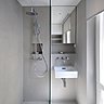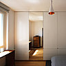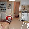 L’architecte a dessiné un séjour lumineux articulé autour d’une bibliothèque avec le mobilier disposé à proximité de 6 tablettes superposées destinées au rangement des livres. Dans cette pièce, un grand plan de travail fait aussi face à la fenêtre. La cuisine, un espace ouvert sur le séjour, intègre aussi toute la technique et le gros électroménager. Elle été parfaitement aménagée avec de nombreux rangements. Rangements que l’on retrouve aussi dans la chambre…Dans la salle de bains, la surface a été fractionnée en 4 zones : une douche à l’italienne, un espace lavabo, les WC suspendus et le lave-linge. Mais l’ensemble du volume a traité comme un espace à part entière avec une mosaïque identique au sol et sur les murs, et une simple paroi de verre pour cloisonner la douche.