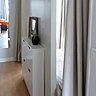 Fauteuils bas en plastique noir et blanc, tapis chiné gris, canapé convertible, petit buffet, lampes en papier… la plupart des éléments décoratifs et du mobilier a été acheté chez Ikea. « On a essayé de composer une ambiance années 1950 d’aujourd’hui, entre esprit rétro et moderne, pour un jeune couple ». Seuls les rideaux occultants ont été confectionnés sur mesure (modèle Bahia, chez Boussac). Que pensez-vous de cette rénovation partielle qui offre du style, à un lieu sans particularités ?