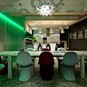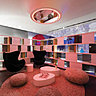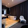 Le propriétaire souhaitait un grand espace ouvert et lumineux pour profiter des différentes perspectives offertes par le lieu extérieur…C’est pour cette raison que les espaces de vie ont été organisés en fonction du cycle du soleil (les chambres sont à l’est, et les espaces de vie sont orientés ouest/sud). A l’intérieur, c’est une véritable promenade graphique avec des jeux de rideaux, d’éclairages colorés et de miroirs… «Le volcan en staff (petit clin d’œil à Oscar Niemeyer) placé au dessus du lounge s’éclaire lui aussi la nuit venue ».