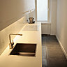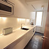 Le propriétaire avait acheté un plateau libre sur chape de béton. Un mur porteur avait été enlevé, mais il n’a pas été remonté à la même place, car l’espace devait être re-cloisonné de façon à ce que chaque pièce possède sa fenêtre (sauf salle de bains). La priorité a été donnée à la pièce à vivre. Tandis que pour la chambre, qui forme une sorte d’alcôve, on a réduit sa surface au minimum pour qu’elle permette simplement d’assurer les fonctions de couchage et de rangement avec une grande penderie qui occupe toute sa largeur. Et la cuisine façon couloir s’est esquissée spontanément dans le volume restant, en parallèle avec le couloir de l’entrée. Entre ces deux zones, l’espace privé de la chambre et de la salle de bains…
