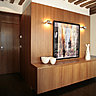 « J’ai dessiné des rangements intégrés qui libèrent visuellement de l’espace. Ils ont été conçus comme une double peau qui s’accroche aux murs. Aucun meuble de rangement n’est mobile. Le buffet de la salle à manger-salon est solidaire d’un panneau mural, entre la poutraison et le parquet. Sans pied, il dessine un volume aérien », explique Laurent Olivier Gros architecte DPLG qui a travaillé les matières dans un esprit de mélange de styles ethniques. Du Brésil à l’Afrique, en passant par l’Asie, il a semé des pistes pour voyager sans bouger de son canapé. Rien de folklorique ni de typique, mais plutôt un mixage de matériaux authentiques. Et la pièce à vivre fait la part belle au bois, avec un parquet en bois sombre et des aménagements en Bete, un bois exotique africain rare.