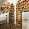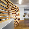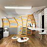 Cet appartement de 60 m² composé de deux pièces principales est caractérisé par l’intégration d’une structure en bois aux formes ondoyantes déclinée en deux fonctions. Dans la pièce à vivre, elle sépare sans cloisonner la cuisine du séjour. De structure ajourée, elle laisse passer la lumière comme un filtre. Dans la chambre, elle joue le rôle de tête de lit tout en habillant le mur et servant de support à des tables de nuit. Chaleureux, ces deux éléments à la présence forte contrastent avec la neutralité des autres aménagements habillés d’une teinte neutre et blanche.