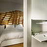 Dans la pièce à vivre, les murs sont recouverts de rangements, toute hauteur et laqués de blanc, qui se confondent avec les murs. Paul Coudamy a eu l’idée d’animer les portes des placards de rainures gravées qui jouent avec la lumière en fonction de la journée. Cet effet graphique allège les masses des caissons et brise leur côté monolithique. Les éléments de la cuisine ouverte ne se démarquent pas des autres rangements pour créer une impression d’unité. Dans la chambre, des tables de chevet intégrées à la tête de lit n’encombrent pas le sol et une grande armoire à la façade vitrée agrandit l’espace.