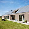 On a choisi des matériaux authentiques et traditionnels. Une charpente et des murs à ossature bois, avec isolation douce, un bardage en bois et une toiture en zinc réinterprètent la construction en archétype d’un nouvel habitat moderne, implanté en pleine campagne. L’épaisseur de la structure de la paroi offre un bon coefficient d’isolation. Pour éviter la surchauffe en été, on a équipé les grandes fenêtres d’auvents intégrés dans le bardage en bois. Les espaces de vie sont orientés vers l’ouest et offrent un point de vue extérieur sur un étang et un petit ruisseau.