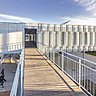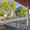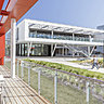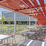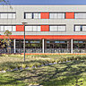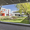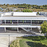 Ici, c’est le sud et les lycéens peuvent profiter durablement des espaces extérieurs et s’y installer une grande partie de l’année. Mais ils doivent aussi être protégés des rayons trop ardents du soleil. Les architectes ont donc prêté une attention toute particulière aux transitions entre l’intérieur et l’extérieur. C’est ainsi qu’au rez-de-chaussée, une terrasse, repérable par son cadre rouge, complète la salle de restauration en l’ouvrant au sud sur la cour tandis que le long de l’internat, une galerie couverte se prolonge dans le jardin par un vaste emmarchement où il fait bon s’assoir. Un petit pavillon blanc, relié aux 2 bâtiments d'enseignement par 2 passerelles à l'étage, accueille le centre de documentation, prolongé par un vaste espace extérieur. Ce balcon sur le jardin, protégé du soleil par une ombrière, devient alors un lieu central de communication et de détente. Sous cette terrasse, au rez-de-chaussée, le préau bien ombragé, est ponctué par le foyer des élèves, lové dans une ellipse de verre.